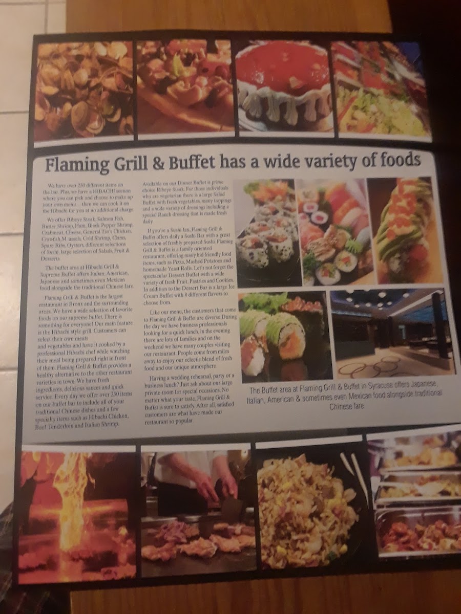 Welcome to Flaming Grill Buffet - Syracuse, a culinary haven located at 244 Northern Lights Plaza, where vibrant flavors meet exceptional service. The menu is a delightful tapestry of Asian-inspired dishes, featuring a tantalizing sushi bar and an interactive hibachi station. Diners are treated to a vast selection that includes succulent honey chicken, crispy crab rangoons, and even comforting pizza—ensuring there's something for everyone.